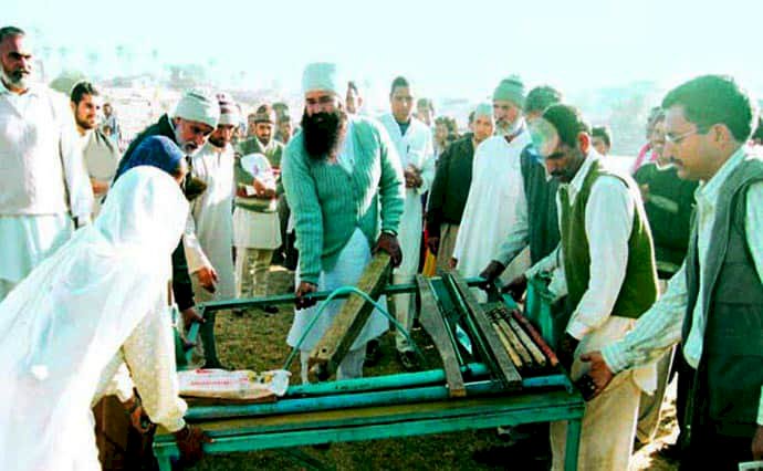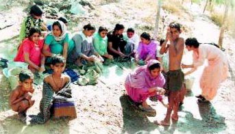 In the Kotra and Jhadol Tehsils of Udaipur district, the tribals were living in a world of delusion, poverty and disease. While addiction to Mahua liquor and illiteracy were near universal, lack of hygiene and an anomalous social code were the other glaring problems. tribal1 Guruji was moved by their plight while on adrought relief mission and vowed to work for their betterment. A sustained door to door campaign of aid distribution was carried out to befriend the intrinsically hostile and violent populace. Following that, a series of Satsangs- in which meditation was taught and the tribals pledged to give up liquor, non-vegetarian diet and immoral conduct. A few hundred dedicated volunteers stayed back to conduct the hygiene and sanitation projects where the tribals were taught to bathe, observe cleanliness and follow a dress code. In the vocational rehabilitation scheme, their women were trained in the art of weaving and the products bought back by the Dera. For this Dera Sacha Sauda gave them 300 wooden looms in june/july 2001 & 500 iron looms in december 2002. The men folk were trained in dry agriculture and water management. The children were enthused and inspired to attend schools. Free looms were provided to the womenfolk to ensure their empowerment and a regular income.